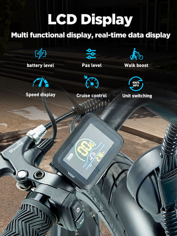 Smart display, which can display total mileage, battery power, speed, 1~5 speed level display. There are three buttons on the display, installed next to the left hand grip, which are used to control the electric mode and power assist mode, as well as control the on and off of the light.